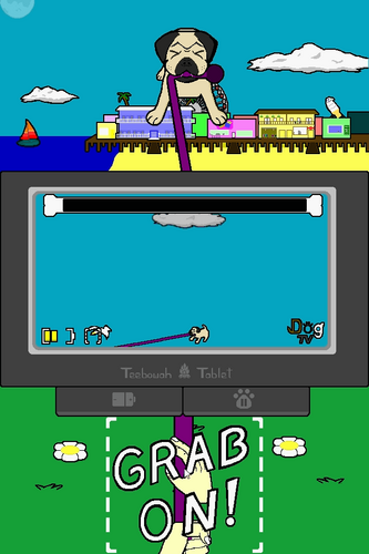 In case you don't prefer tutorials, you hold onto a rope (Hold Left Click) while the dog tugs at it while the dogs strength builds up shown by the meter on the tablet. Once the meter is full the dog will try to rip the rope from you, if you let go at the right time (Release Mouse Click) the dog will fly up and back into the air. Right before the dog lands, grab back onto the rope.